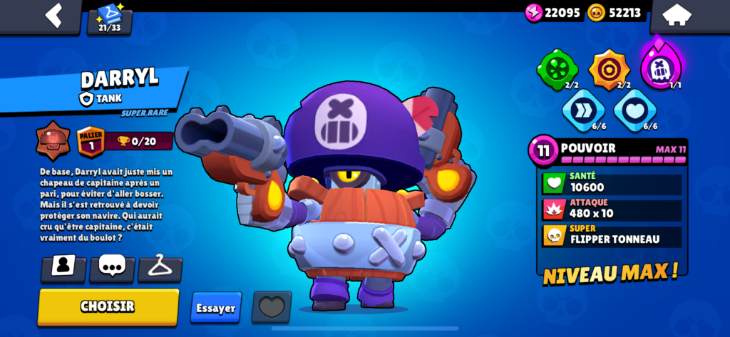 Darryl est un tank avec une spécificités qui est qu’il charge son super avec le temps avec sa portée courte et ses gros dégâts. Au pouvoir 11 il fait 4800 au corps à corps soit 480 x 10.