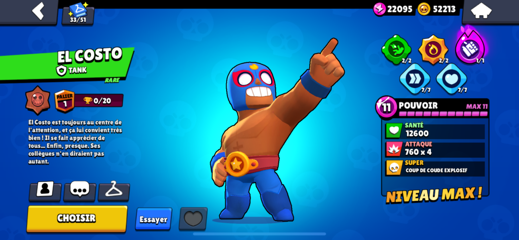• Gadget : supplément suplex ; Equipement : bouclier et force ; Pouvoir Star : el fuego ; Hypercharge conséillée